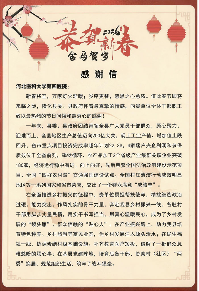 2月13日,我院党委收到来自中共隆化县委隆化县人民政府的一封感谢信,信中高度肯定我院驻村干部在产业振兴、民生福祉、基层党建等方面的突出贡献,提到驻村干部立足村情实际,用脚步丈量民情,用实干书写担当,用真心温暖民心,成为了乡村发展的“领头雁”、群众信赖的“贴心人”。信中还指出,我院协调争取的财政、农业、水利、交通等多部门资源支持,为隆化县乡村振兴注入了强劲动能,推动村级产业项目落地见效、基础设施提档升级、群众增收渠道持续拓宽。